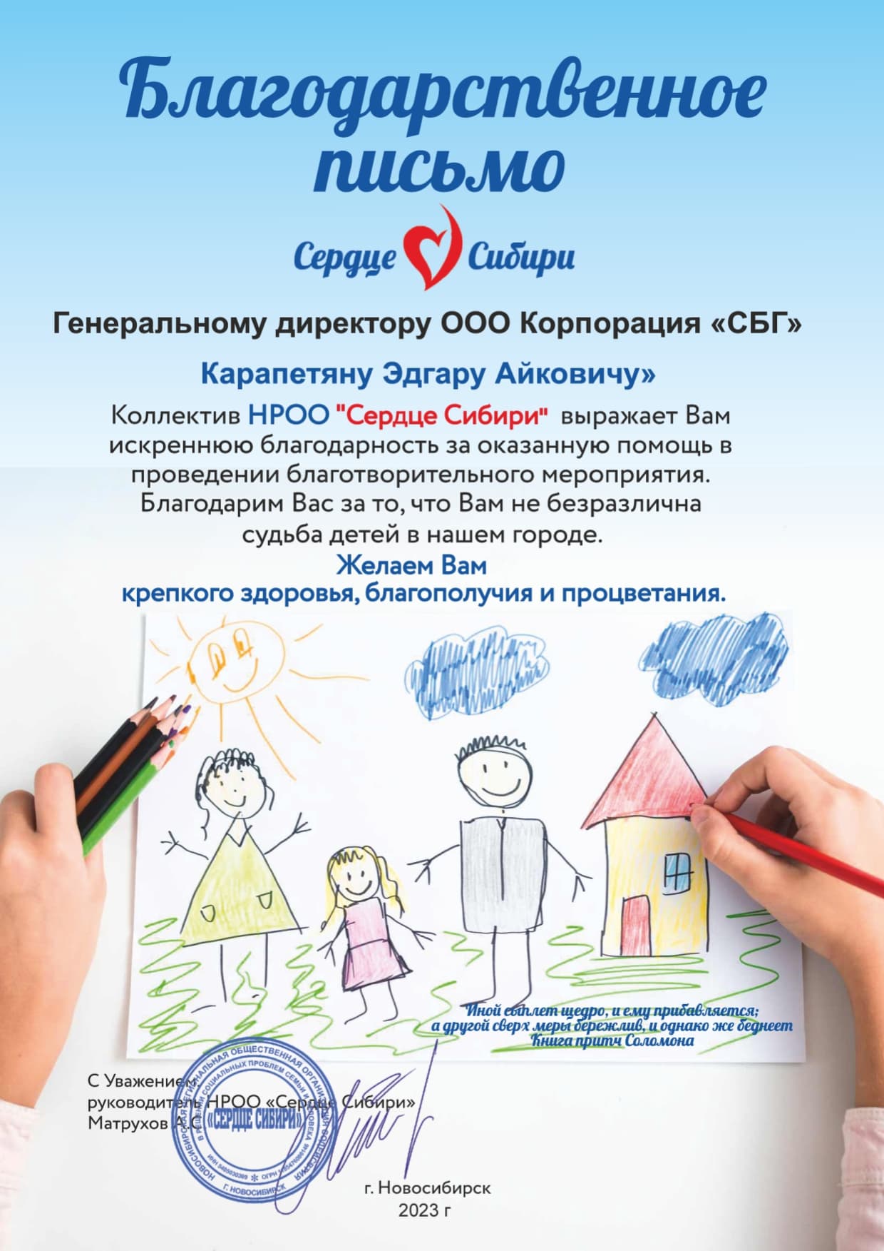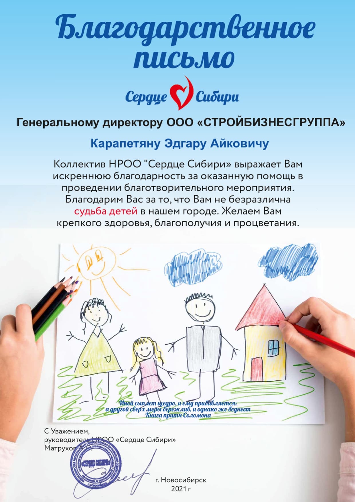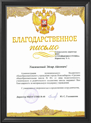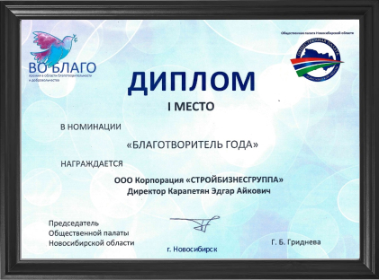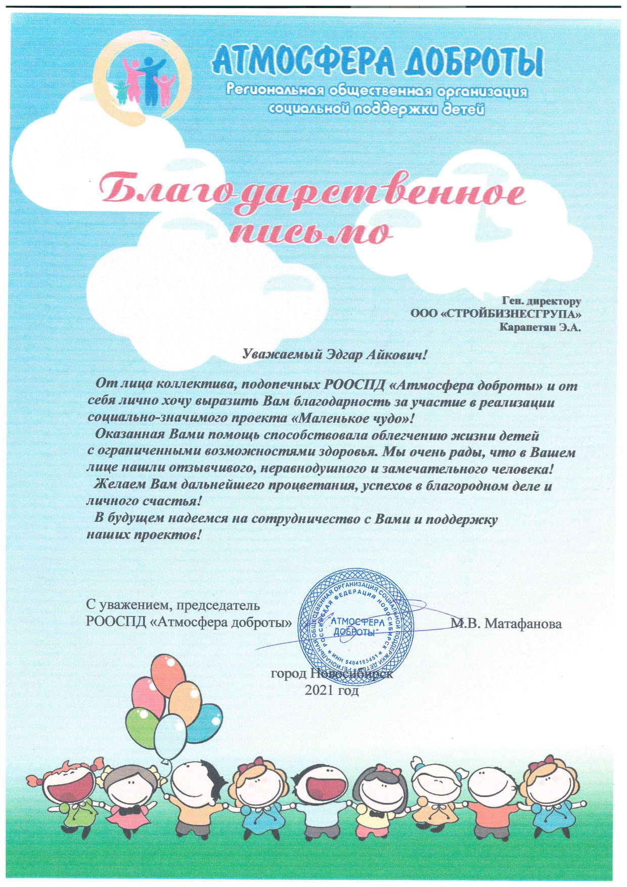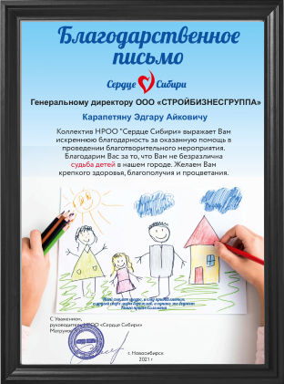ООО «СТРОЙБИЗНЕСГРУППА» в лице руководителя Эдгара Айковича оказала финансовую помощь Региональной общественной организации социальной поддержки детей «Атмосфера доброты», в реализации социально-значимого проекта «Маленькое чудо».