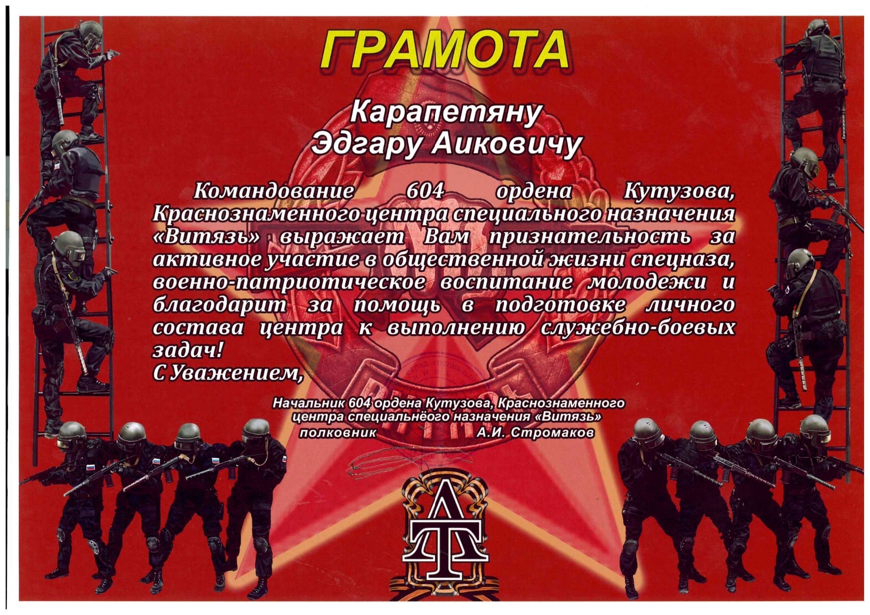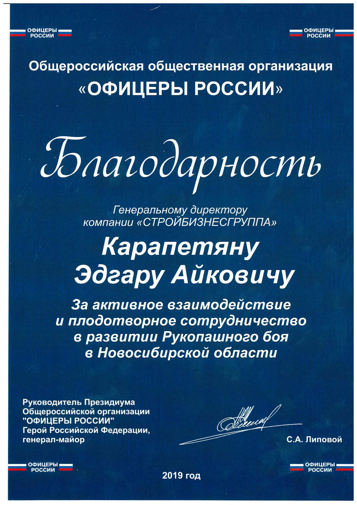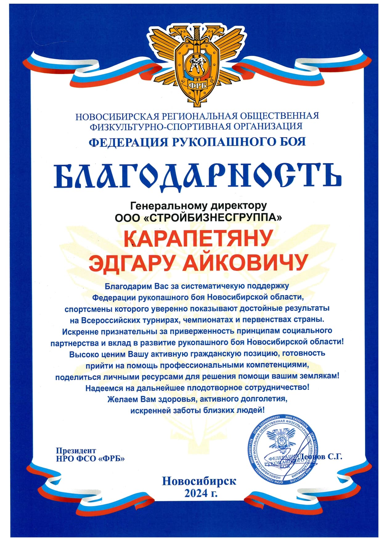 Президент Федерации Рукопашного Боя обратился к генеральному директору Корпорации «СБГ» с просьбой о покупке авиабилетов для сборной Новосибирской области на Первенство России по рукопашному бою в Астрахани. Просьбу Эдгар Айкович выполнил и ребята поехали на соревнование ради достижения заветной цели − стать победителем в своей весовой категории.